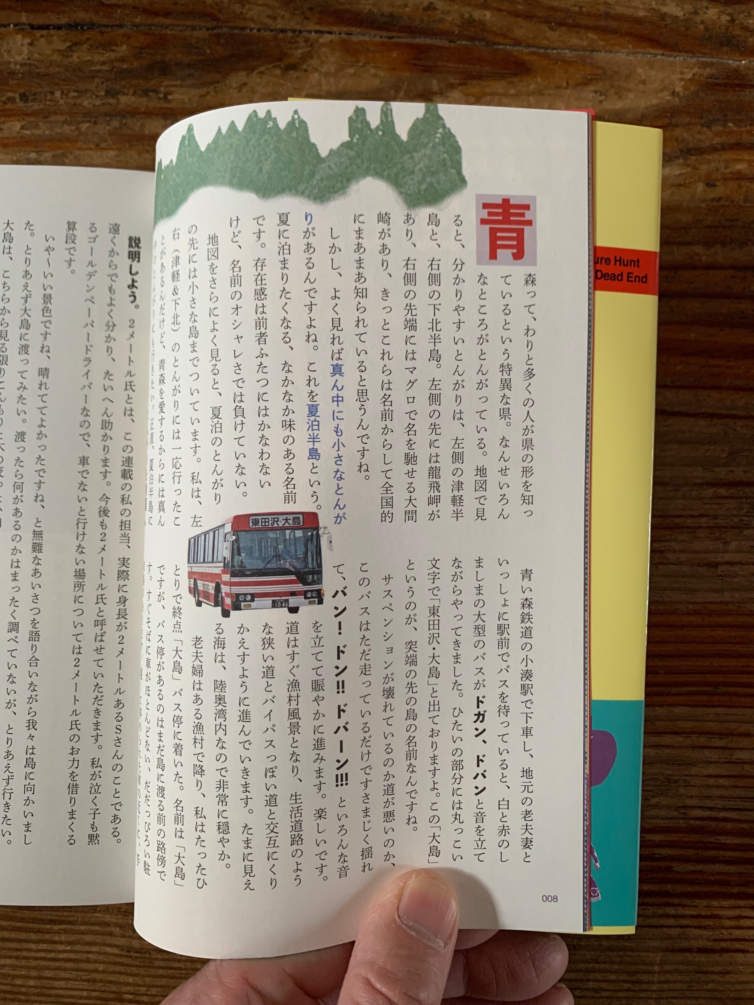 行き止まりという言葉はネガティブなイメージがあるけど、行き止まりにはいろいろなものがたまって、積み重なって、濃くなる。いろんな要素がぎっしり凝縮して化学反応を起こす。そう私は信じています。四方八方が見える開けた場所よりも、へりの、隅っこの、先っぽの、この先どこにも行けない、という行き止まり(英語で言うと、デッドエンド)にこそ宝があると信じて、私は青森をおもしろがっているのです。