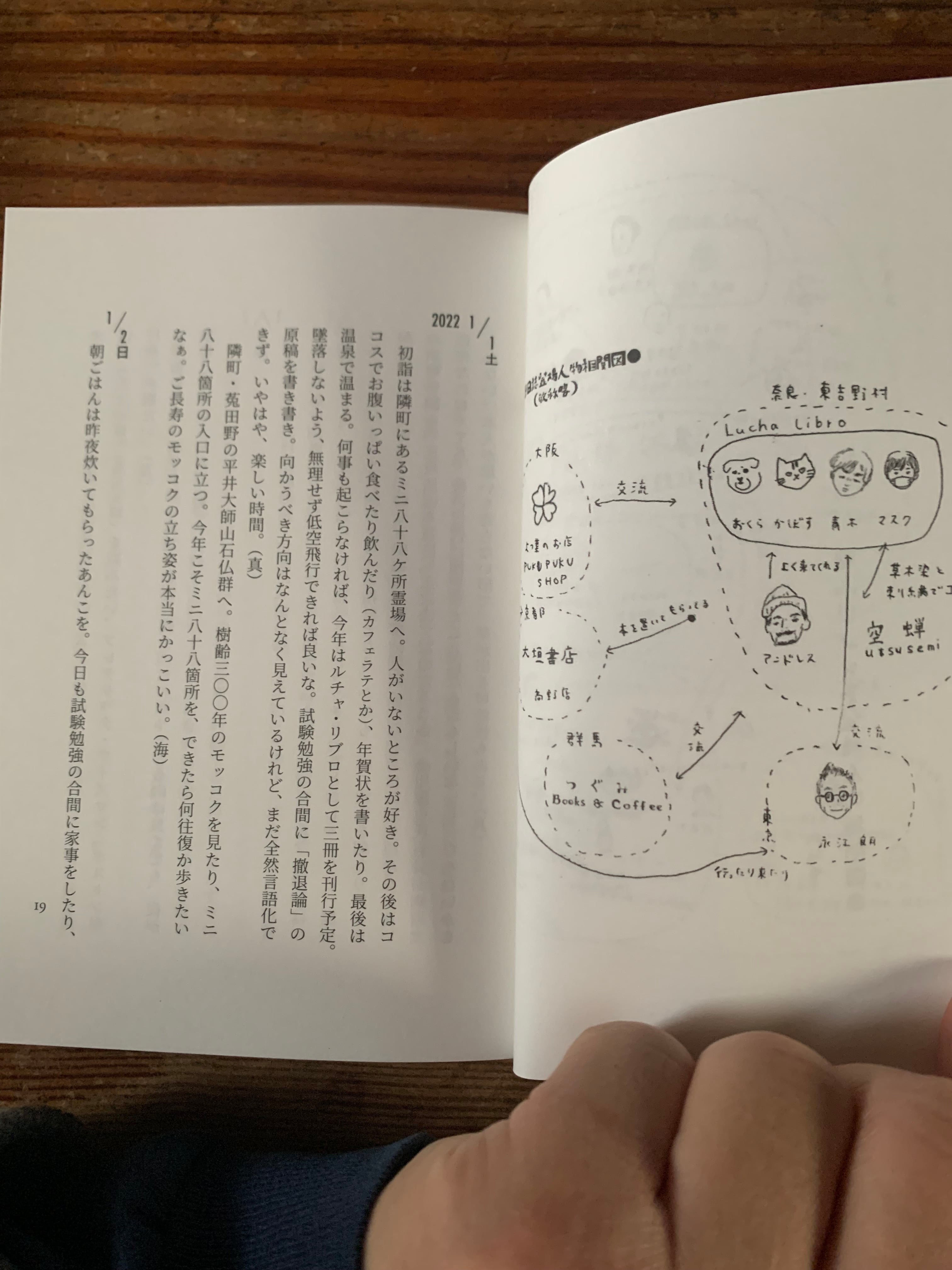 奈良県東吉野村。人口一五〇〇人の村の山あいに佇む一軒家、人文系私設図書館「ルチャ・リブロ」。自宅を開放して図書館を運営する夫婦が、仕事に、生活に、山村と街を、あるいは彼岸と此岸を往復しながら綴った日記に、エッセイや草稿「研究ノオト」を収録した、日記帳。