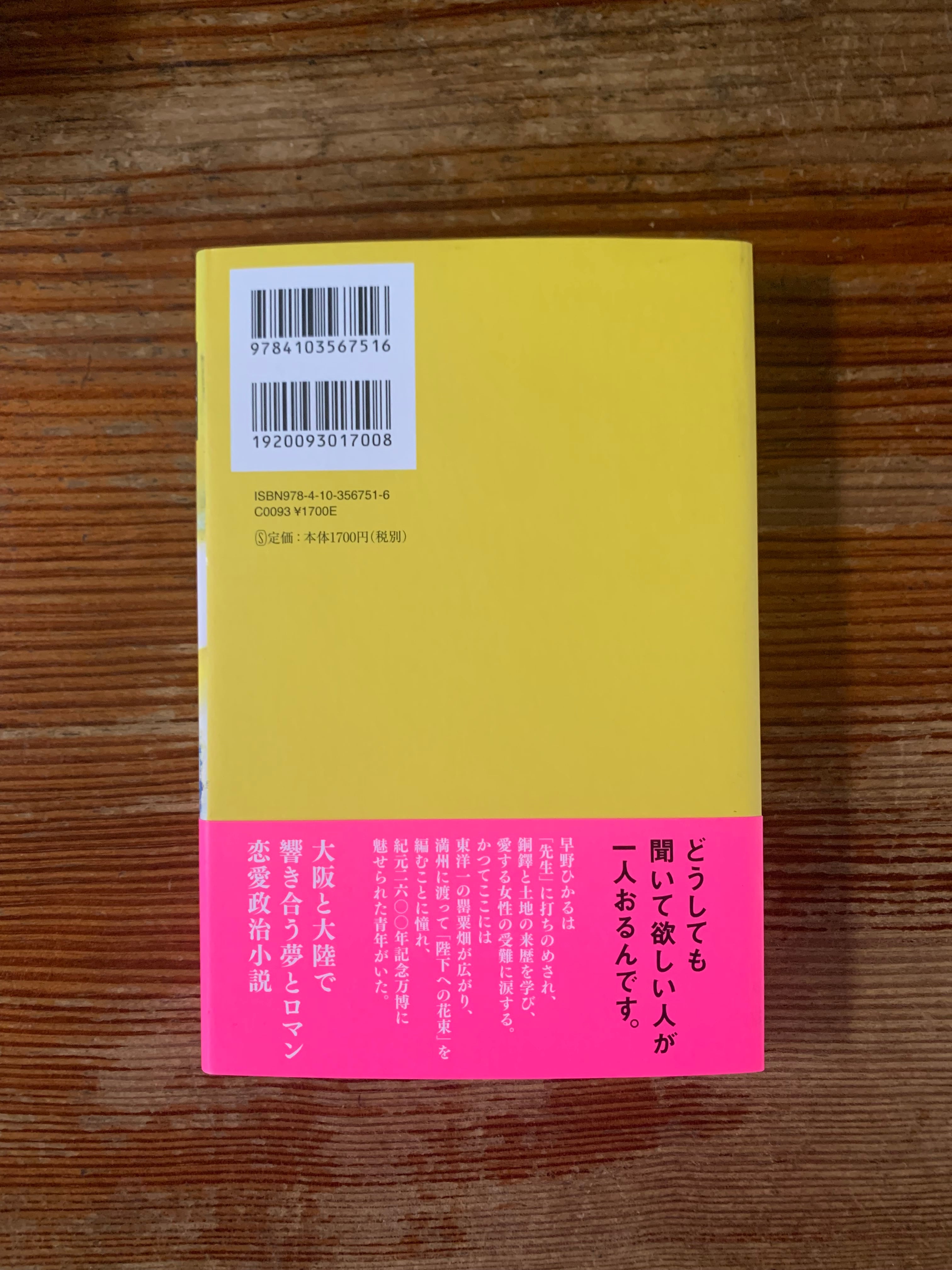 早野ひかるは「先生」に打ちのめされ、銅鐸と土地の来歴を学び始める。ここではかつて罌粟栽培と阿片製造が盛んで、満州に渡って「陛下への花束」を編み、紀元2600年記念万博を楽しみにしていた青年がいた。いつしか昭和と令和はつながり、封印されていた声が溢れ出す。大阪と大陸で響き合う夢とロマン、恋愛政治小説。