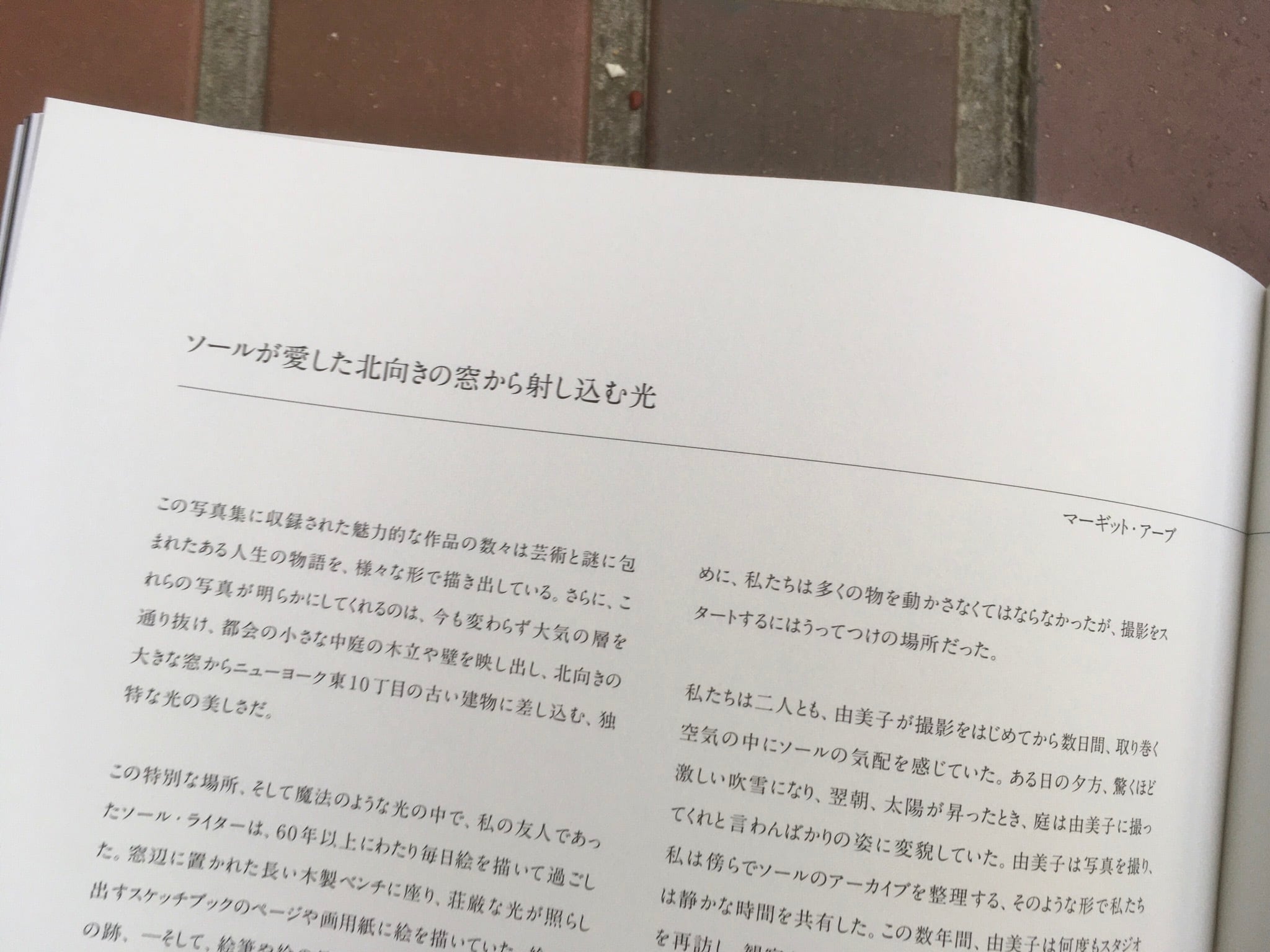 ソール・ライターに初めて私が出会ったのは、ニューヨークのハワード・グリーンバーグギャラリーのキッチンだった。ソールからアパートメントに遊びにきたらどうかと誘われた私は、彼の作品に強く惹かれていたこともあり、招待に快く応じた。ソール・ライターの魅惑的で創造性に満ちた場所に、この後何度も訪れることになるとは、その時の私にはまだ知る由もなかった。