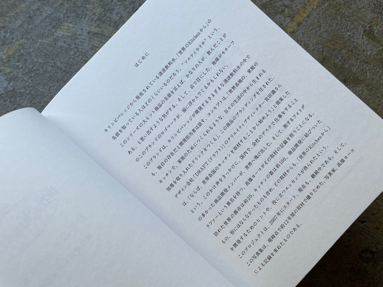 キリンビバレッジの人気商品、清涼飲料水「世界のキッチンから」の商品開発のための取材(世界約20都市を訪問)時に撮影した高橋ヨーコさんの写真を束ねた1冊。世界中の家庭のキッチンや料理、それから街の風景を眺めながら、旅する気分を味わえる。また、商品開発チームへのインタビュー等も掲載し、写真集の枠を越えて、写真と商品開発の関係を解き明かす内容になっている。