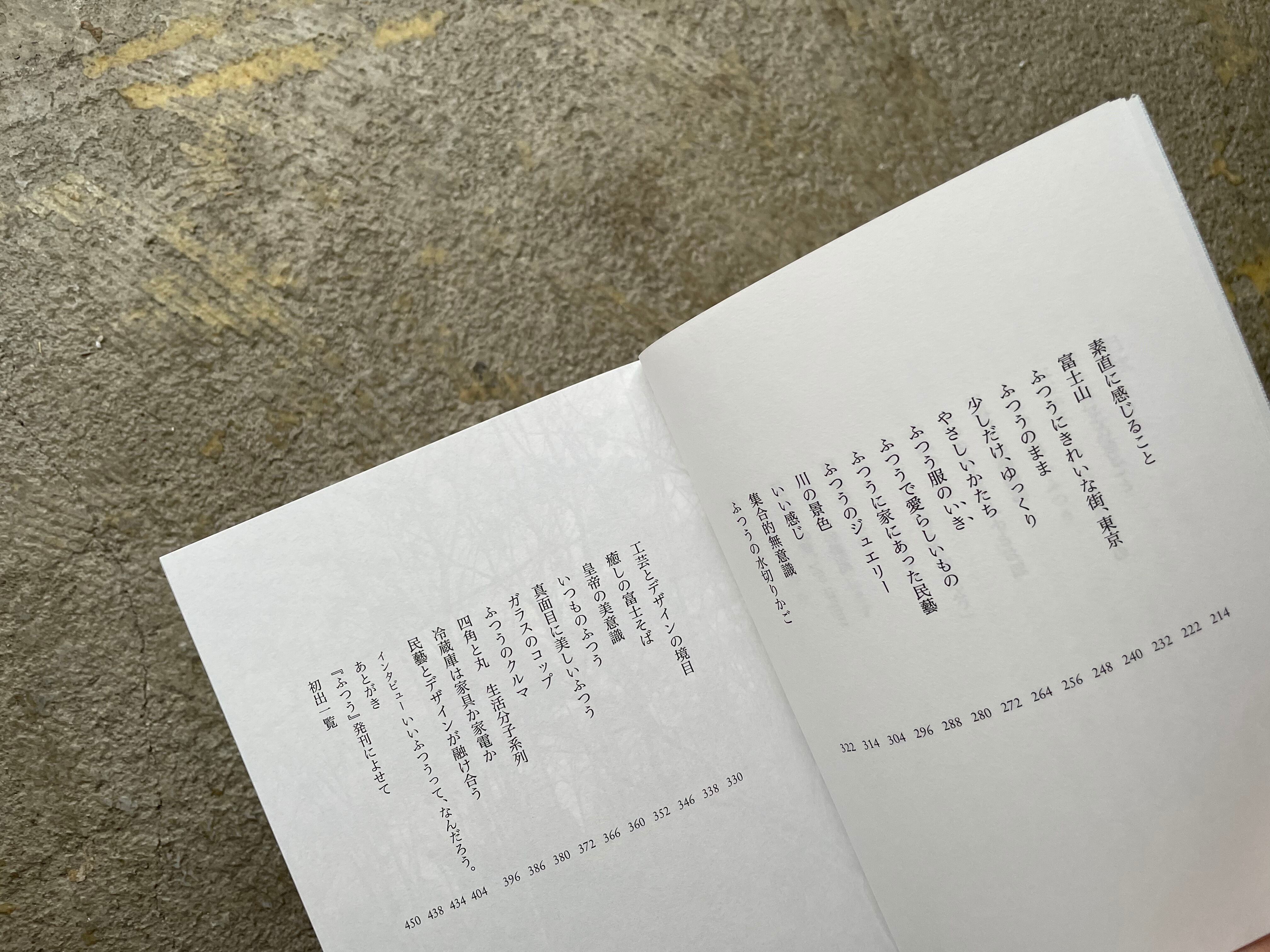 ちょっといいふつう/日常の感触/まっとうしたふつう/意識の中心/「ふつう」を超える「ふつう」 /かっこいいふつう/中庸のデザイン/ふつうをお願いします/ふつうの曲/スーパーノーマル/ふつうの犬/素のよさ/ふつうの表情/No straight, No radius/「ふつう」の番組/磨かれたふつう/アフォーダンスとふつう/ふつうのジャングルジム/ふつうの家/ムジのカトラリーとお皿/「ふつう」の輪郭/ふつうの棚/ふつうのもの、みんなのもの/変えないということ/古びるものを/素直に感じること/富士山/ふつうにきれいな街、東京/ふつうのまま/少しだけ、ゆっくり/やさしいかたち/ふつう服のいき/ふつうで愛らしいもの/ふつうに家にあった民藝/ふつうのジュエリー/川の景色/いい感じ/集合的無意識/ふつうの水切りかご/工芸とデザインの境目/癒しの富士そば/皇帝の美意識/いつものふつう/真面目に美しいふつう/ガラスのコップ/ふつうのクルマ/四角と丸 生活分子系列/冷蔵庫は家具か家電か/民藝とデザインが融け合う
