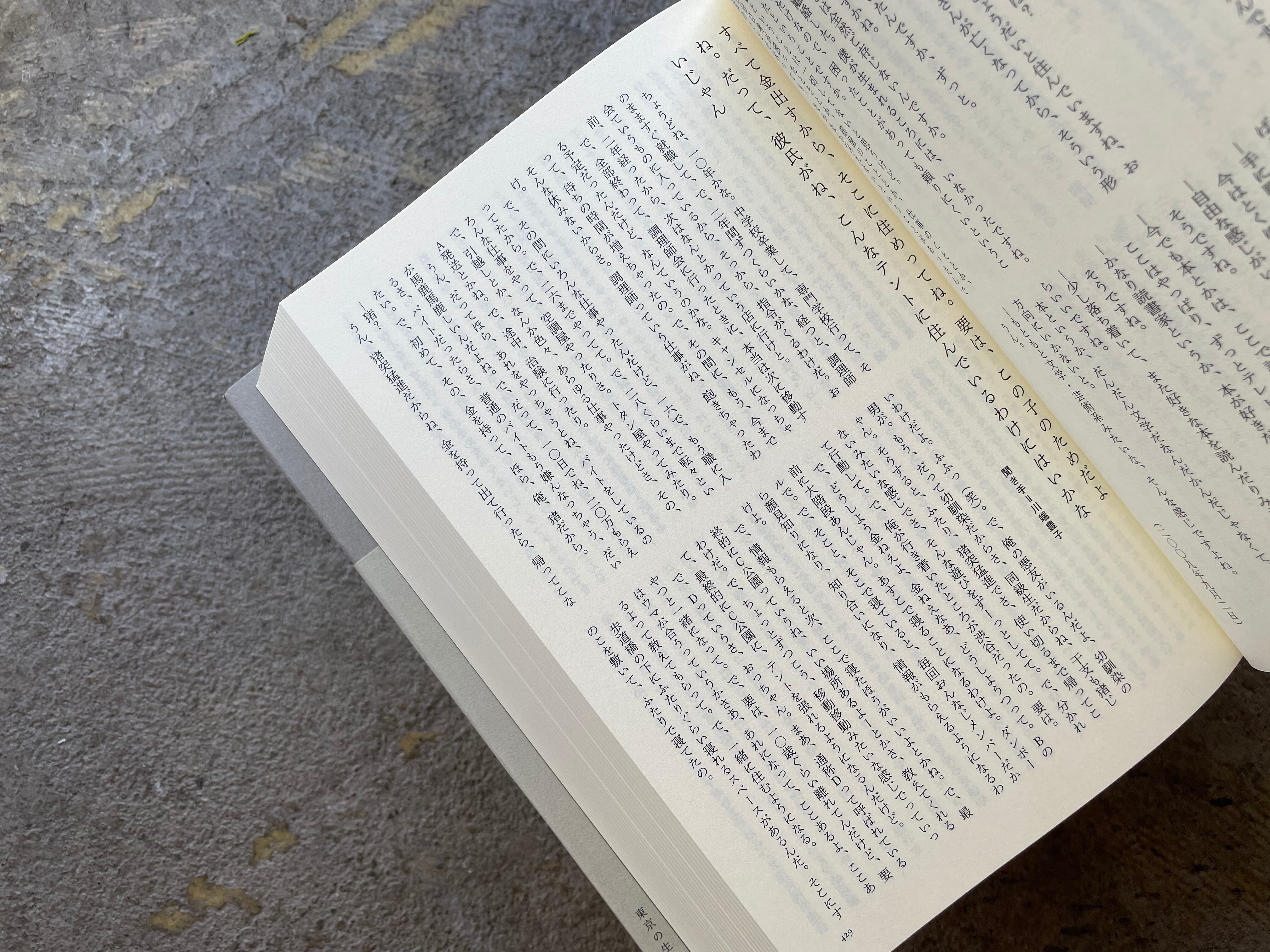だからこの本は、都市を、あるいは東京を、遂行的に再現する作品である。本書の成り立ち自体が、東京の成り立ちを再現しているのである。それは東京の「代表」でもなければ「縮図」でもない。それは、東京のあらゆる人びとの交わりと集まりを縮小コピーした模型ではないのだ。ただ本書は、偶然と必然によって集められた語りが並んでいる。そして、その、偶然と必然によって人びとが隣り合っている、ということそのものが、「東京」を再現しているのである。