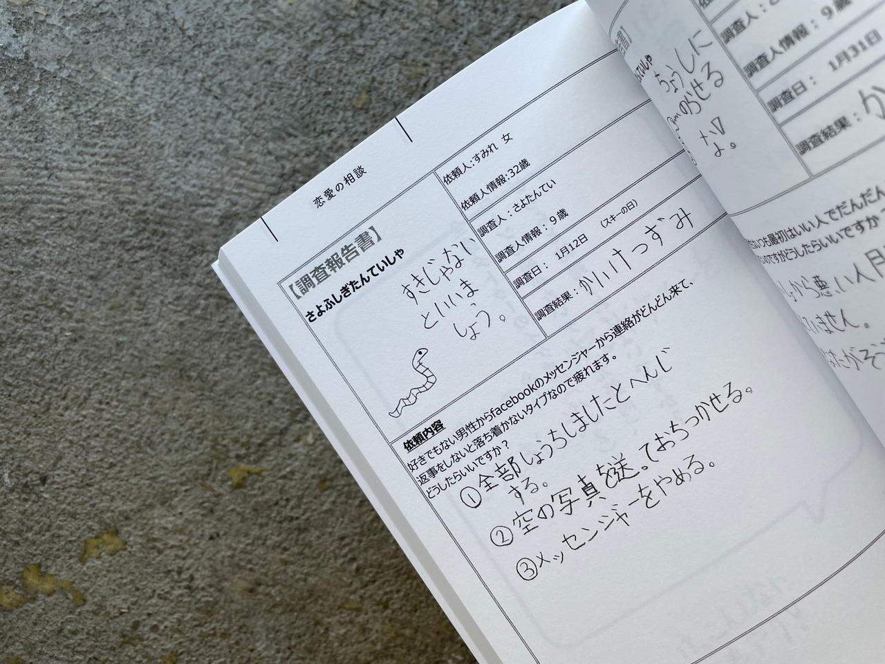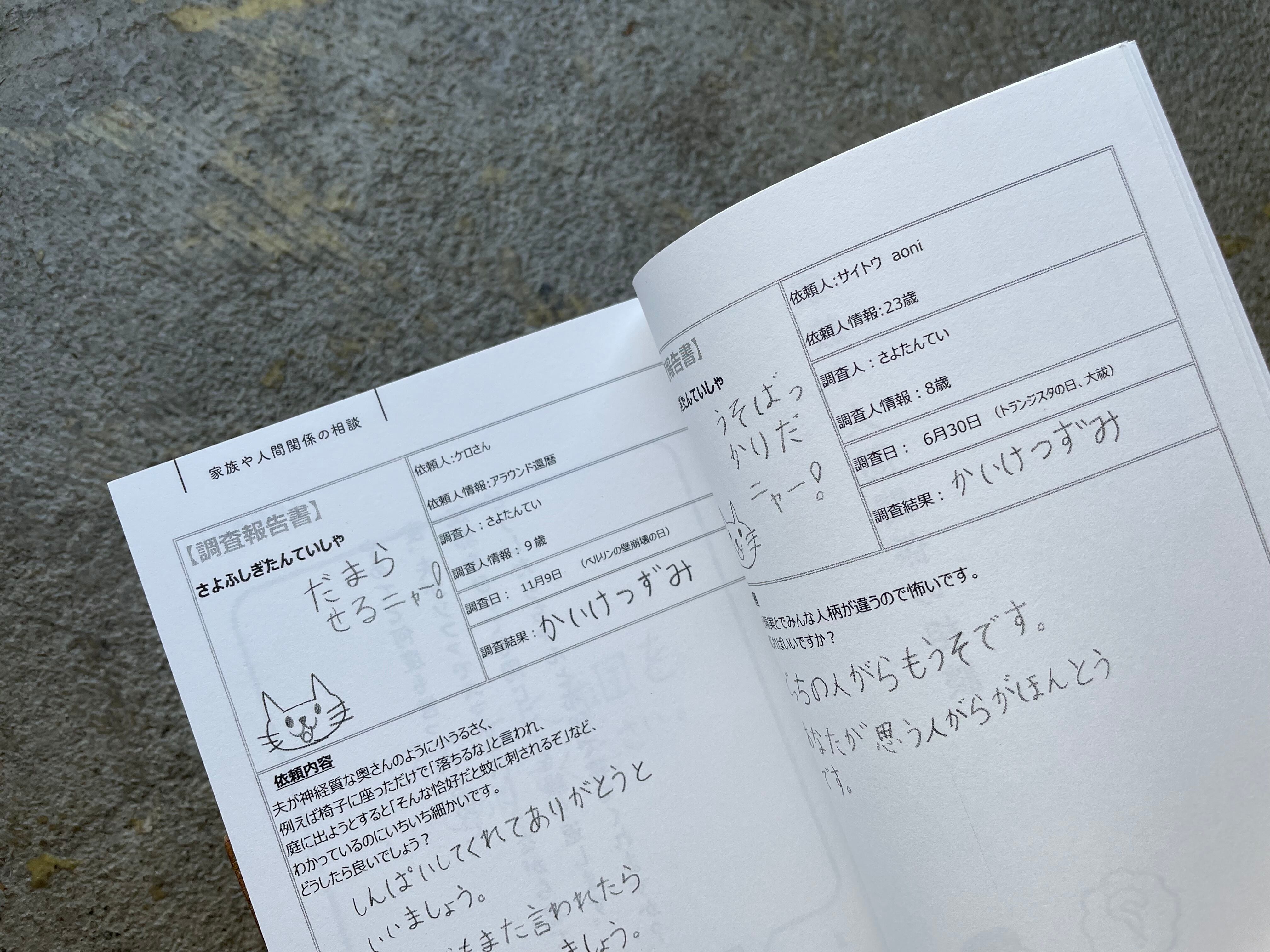 約2年前に、関西在住の小学3年生の女の子「さよたんてい」がはじめた、どんなお悩みも解決する「さよふしぎたんていしゃ」。お悩みに答えるインスタグラムのアカウントや、その回答をまとめた自費出版本「こんにちは!さよふしぎたんていしゃです!」が大きな話題となり、テレビや雑誌など多くのメディアに取り上げられました。そして、このたび、過去の名回答のほか新作も大量に追加し書籍化です!